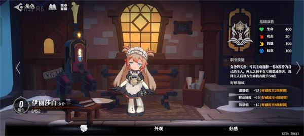 女仆,技能是选择一个人当主人,两人不能互相伤害,且两人增加50生命,这是个比较极端的角色,选择的人好,那就可以优雅躺平,选的是狼,那就原地去世,简单来说就是抱大腿,但千万别抱错了,推荐度S