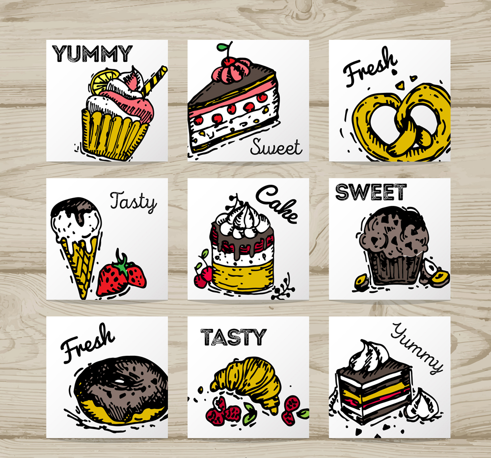 AI格式,含JPG预览图,关键字:木板,纸杯蛋糕,三角蛋糕,蝴蝶脆饼,冰淇淋,草莓,蛋糕,牛角面包,甜甜圈,巧克力,彩绘,甜点,卡片,矢量图...