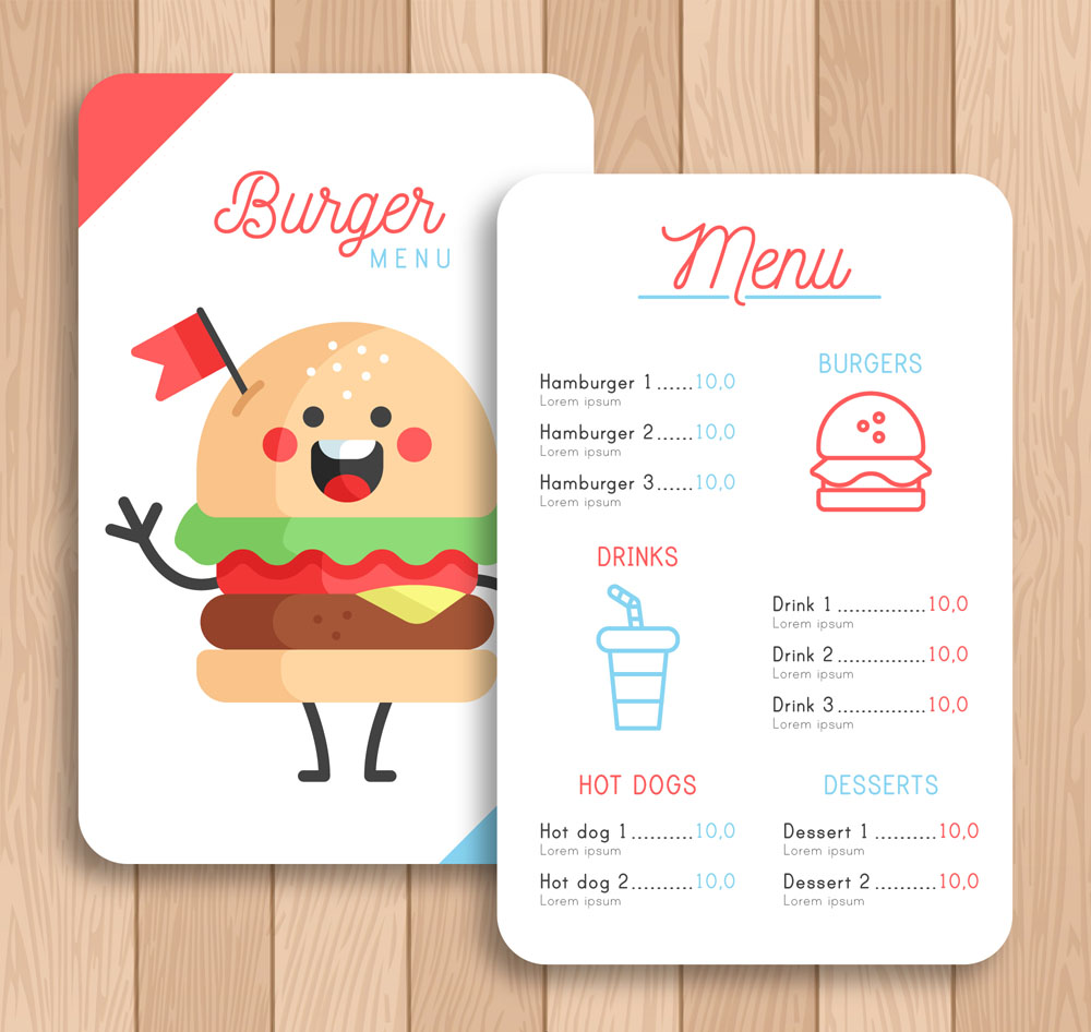 AI格式,含JPG预览图,关键字:木板,价格,饮料,热狗,快餐,餐馆,表情,汉堡包,正反面,菜单,矢量图...