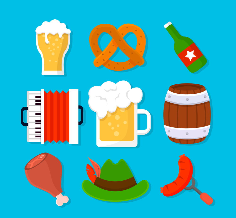AI格式,含JPG预览图,关键字:食物,啤酒,蝴蝶脆饼,啤酒杯,啤酒瓶,手风琴,橡木桶,猪腿,帽子,叉子,香肠,彩色,慕尼黑,啤酒节,矢量图...