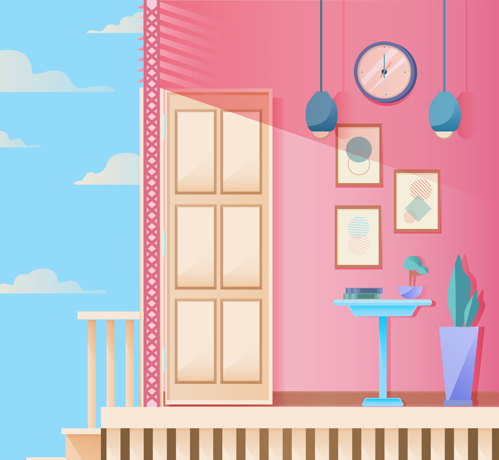 AI格式,含JPG预览图,关键字:挂画,吊灯,时钟,盆栽,云朵,门,桌子,粉色,客厅,走廊,家居,楼梯,楼房,家,矢量图...