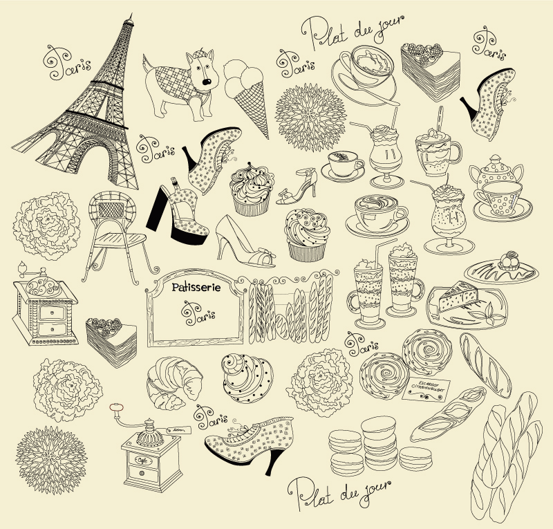 EPS格式,含JPG预览图,关键字:巴黎,巴黎铁塔,甜品,宠物狗,时尚,配饰,时装,鞋子,面包,甜点,马卡龙,法式长棍面包,矢量图...